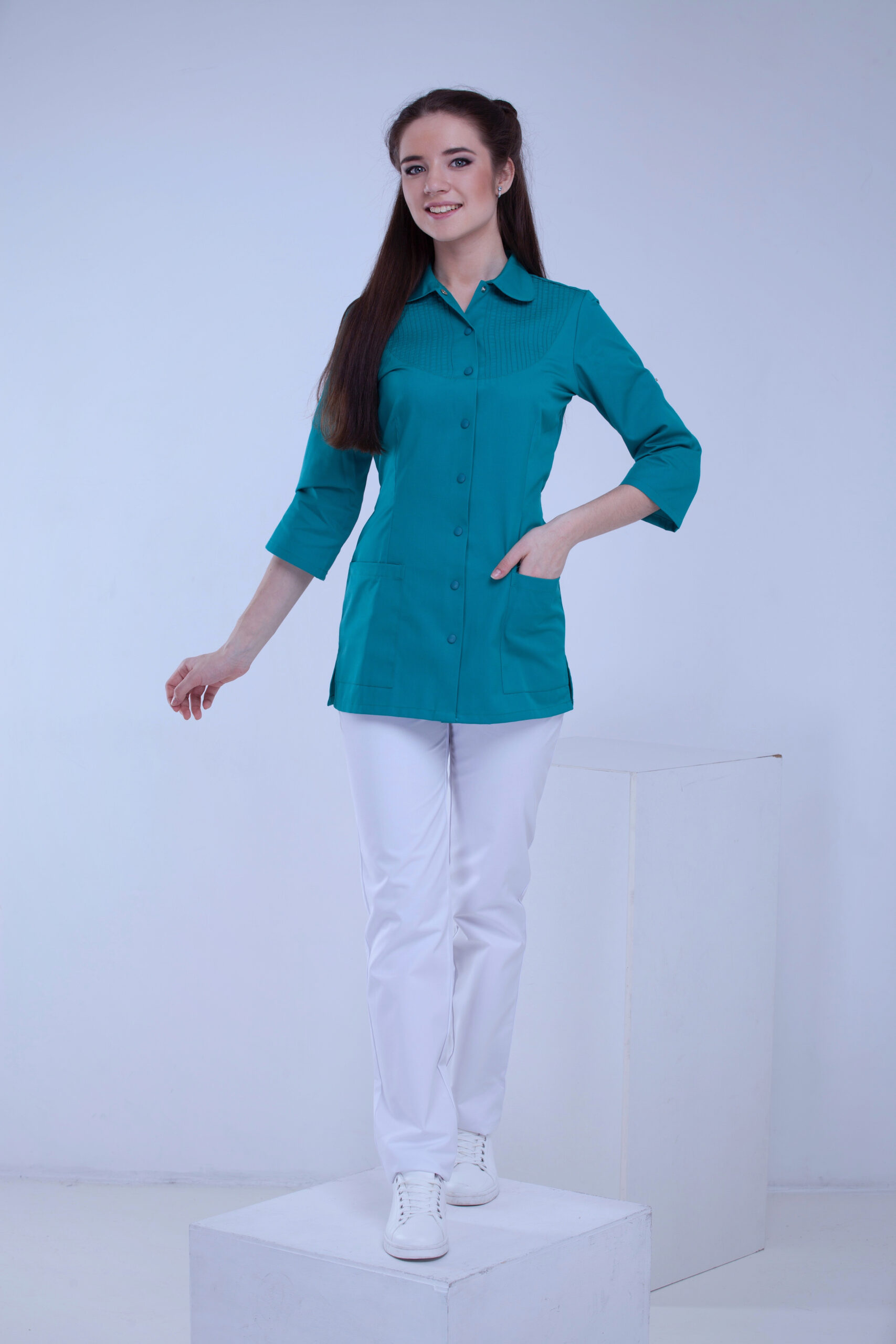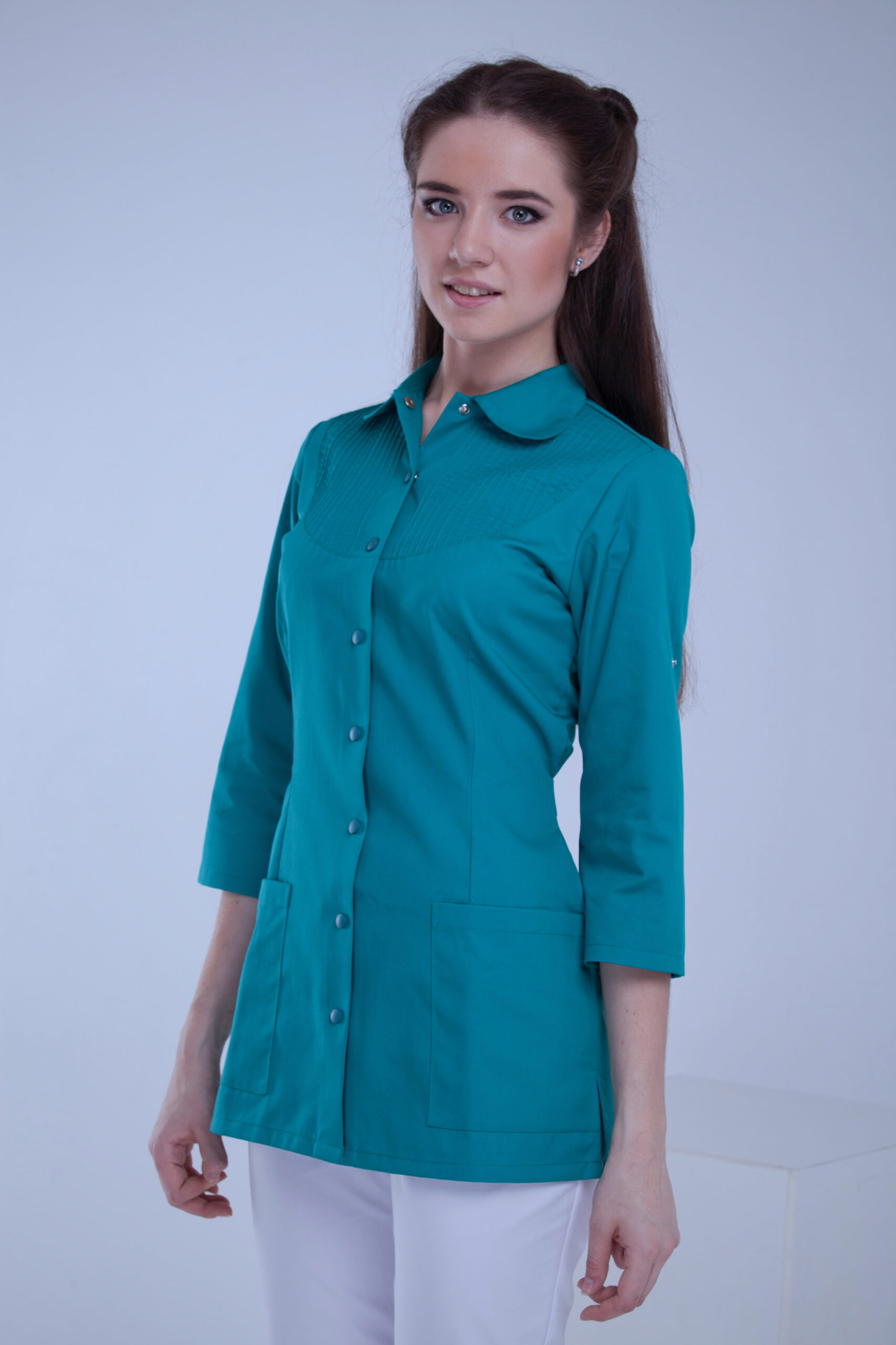 Лінія кокетки м’яко структурує силует, створюючи відчуття легкості та вивіреної естетики. Акуратна відстрочка підкреслює геометрію крою, додаючи глибини та характеру кожній деталі.